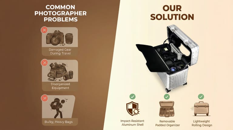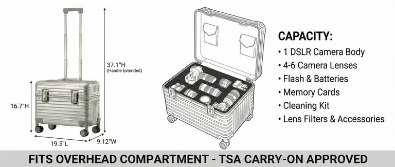 Safely travel with your valuable camera equipment using this durable aluminum carry-on case. Designed with customizable foam inserts to fit lenses, bodies, and accessories, this stylish rolling case offers protection and convenience for professional and hobbyist photographers. Secure latches, smooth wheels, and a roomy interior ensure your gear stays organized and protected during transit.
